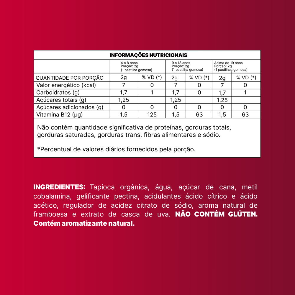 Tapioca orgânica, água, açúcar de cana natural, metilcobalamina, pectina, ácido cítrico, ácido acético, citrato de sódio, aroma natural de framboesa e extrato da casca de uva.